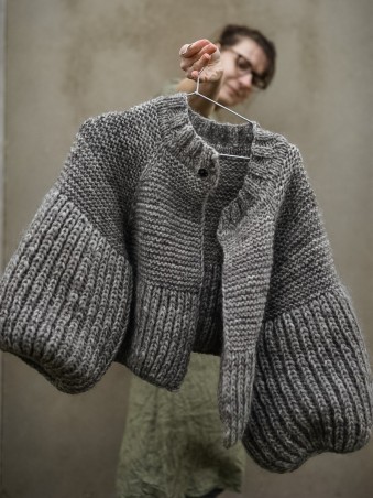 The Grey sheep jacket is a short-length knit with 3/4 big balloon sleeves. The jacket has one snap fastener in the neckline and the rest of the front band is buttonless. It is worked top-down. Sleeves and the body are worked in Fisherman rib stitch. Sleeves are without cuffs and the body is without hem. Because the cardigan body and sleeves are worked straight it can be easily made longer and of course, more yarns should be estimated. Grey sheep jacket is a short fashionable cardigan that fits well with high waist jeans or shorts.